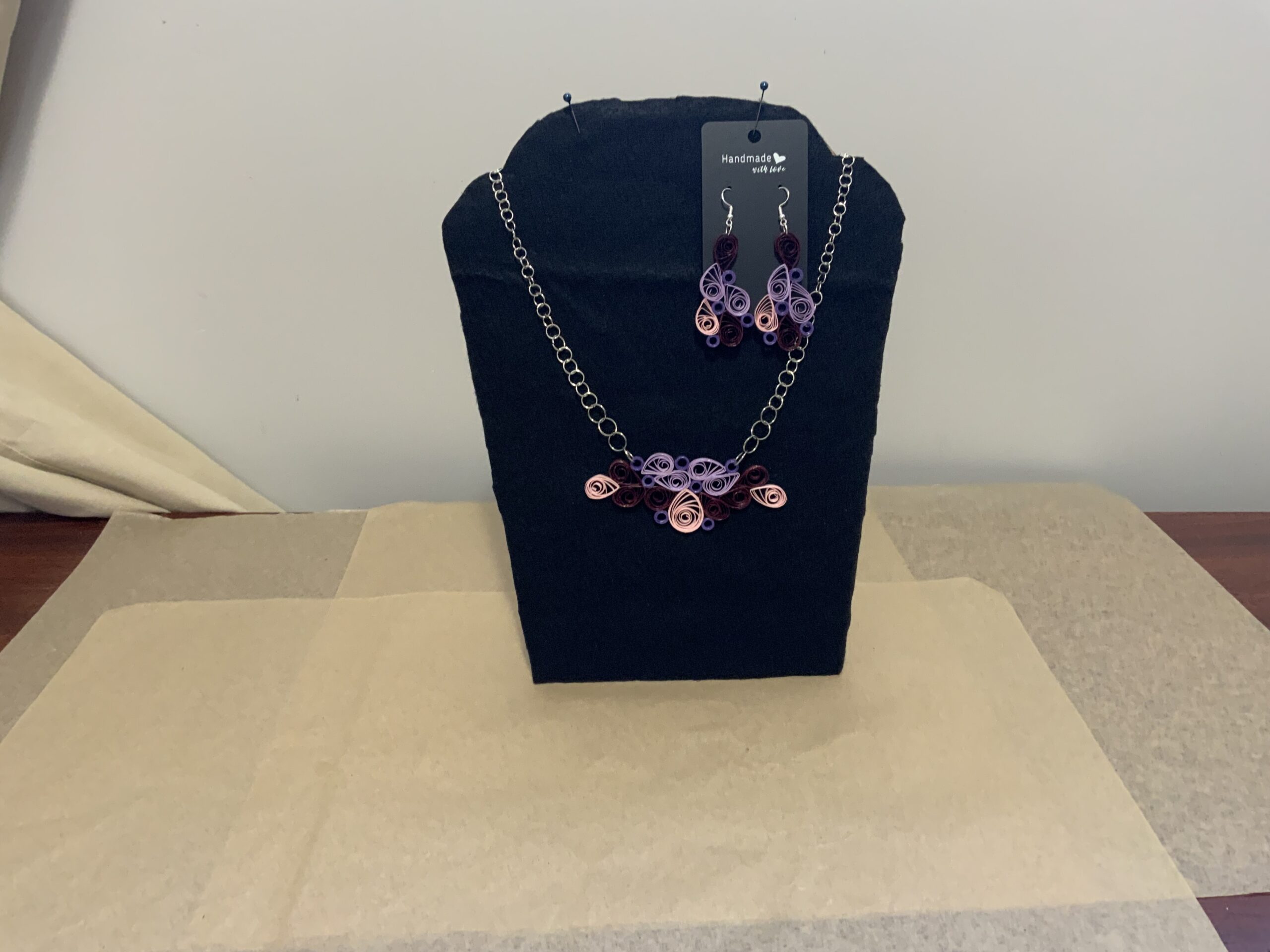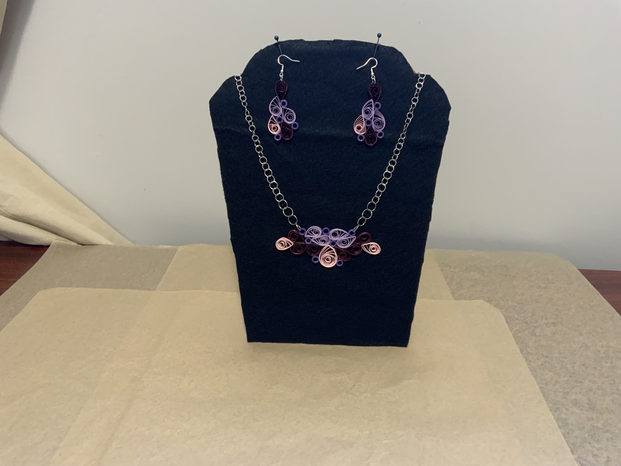 Introducing this one-of-a-kind, elegant and eye-catching handmade quilled jewelry set, featuring a stunning four-tone color palette. Carefully crafted using the traditional art of paper quilling, this earrings and necklace set is made from natural materials and designed to be a true statement piece — special, unique, and unforgettable.