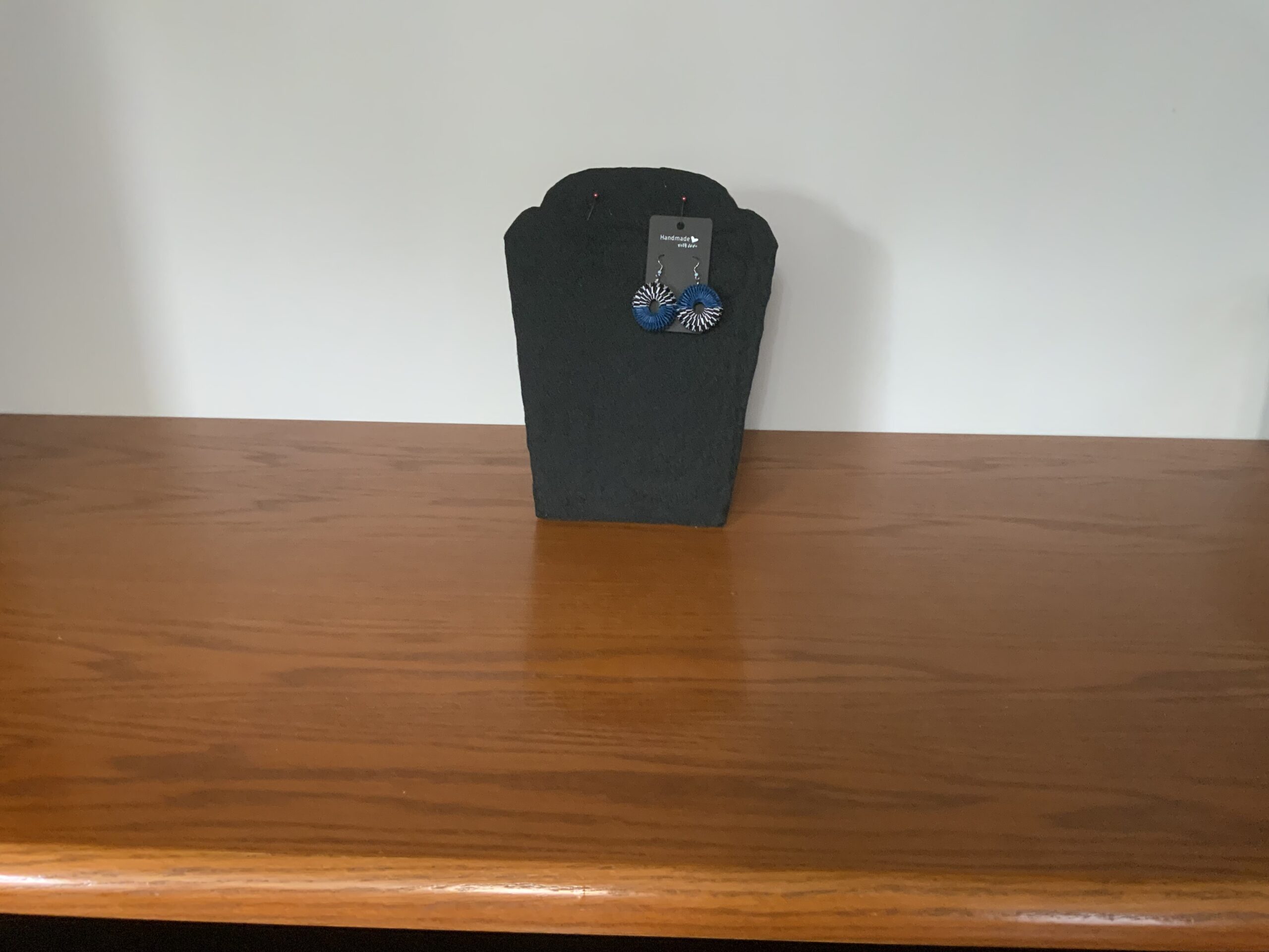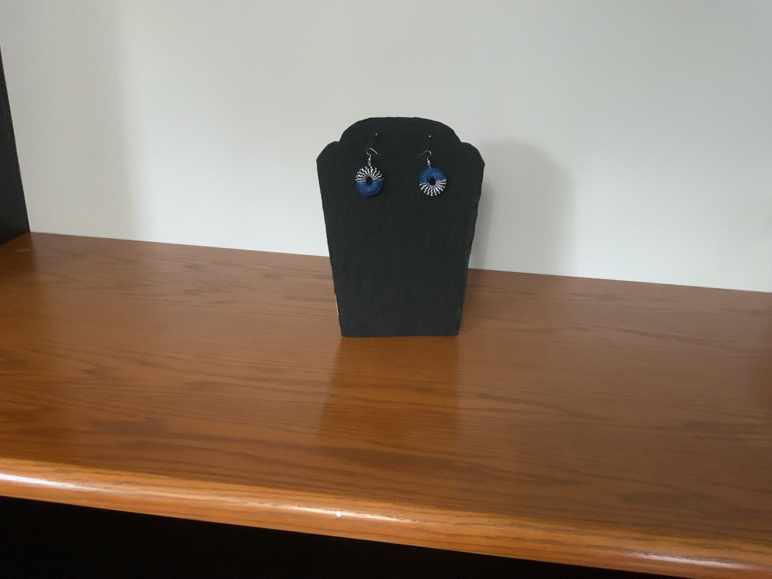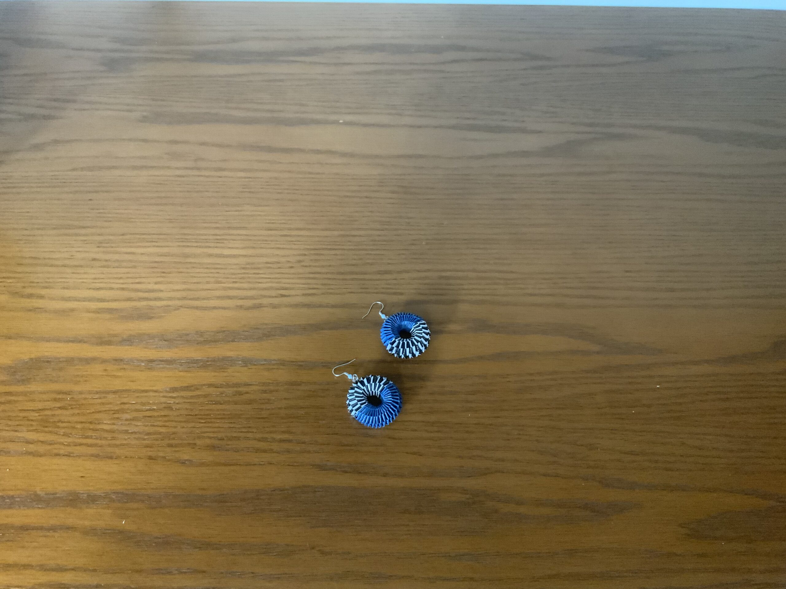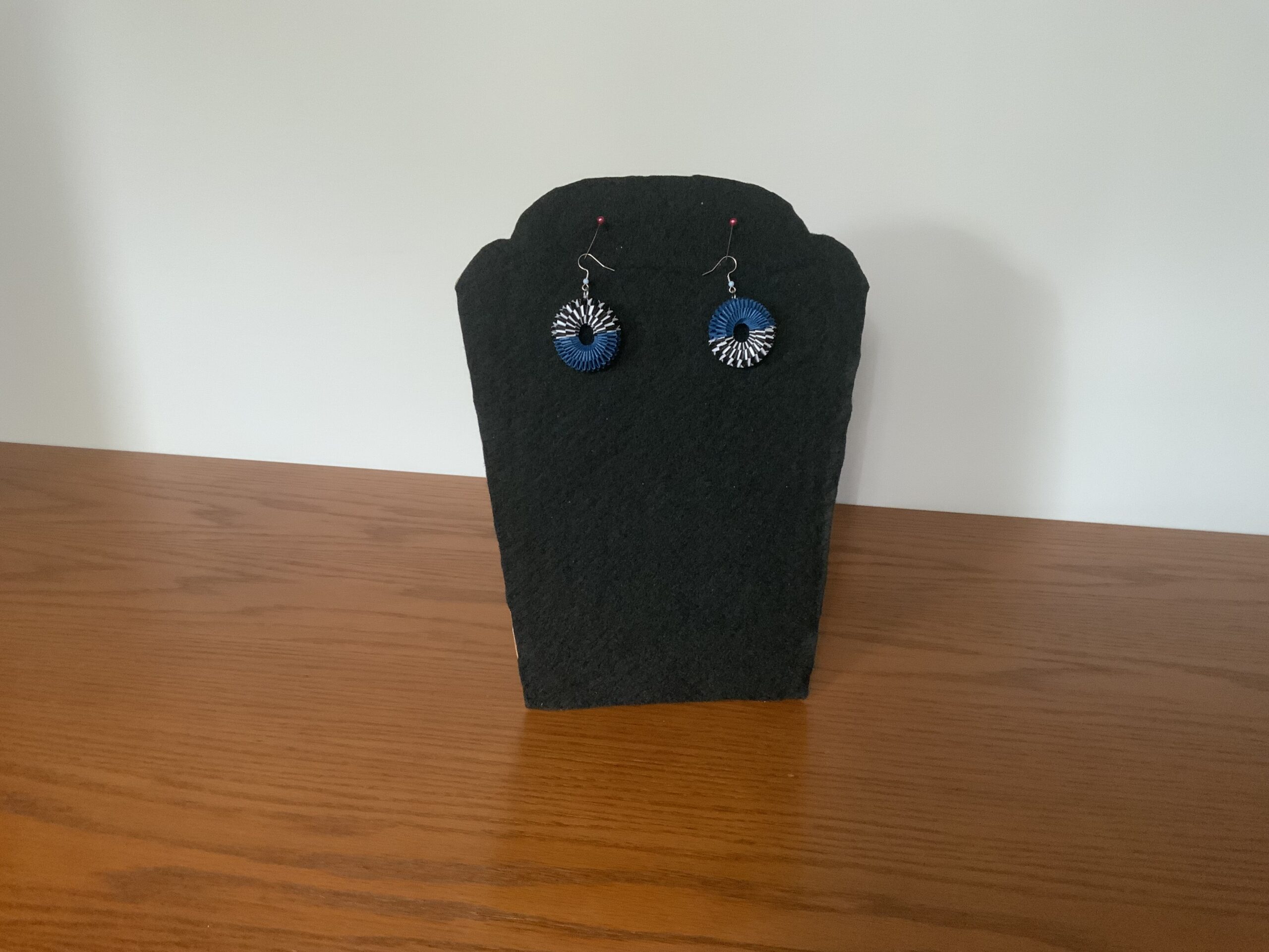 Featuring a striking mix of vibrant blue, black, and white, these one-of-a-kind earrings are guaranteed to be the showcase piece at any get-together.