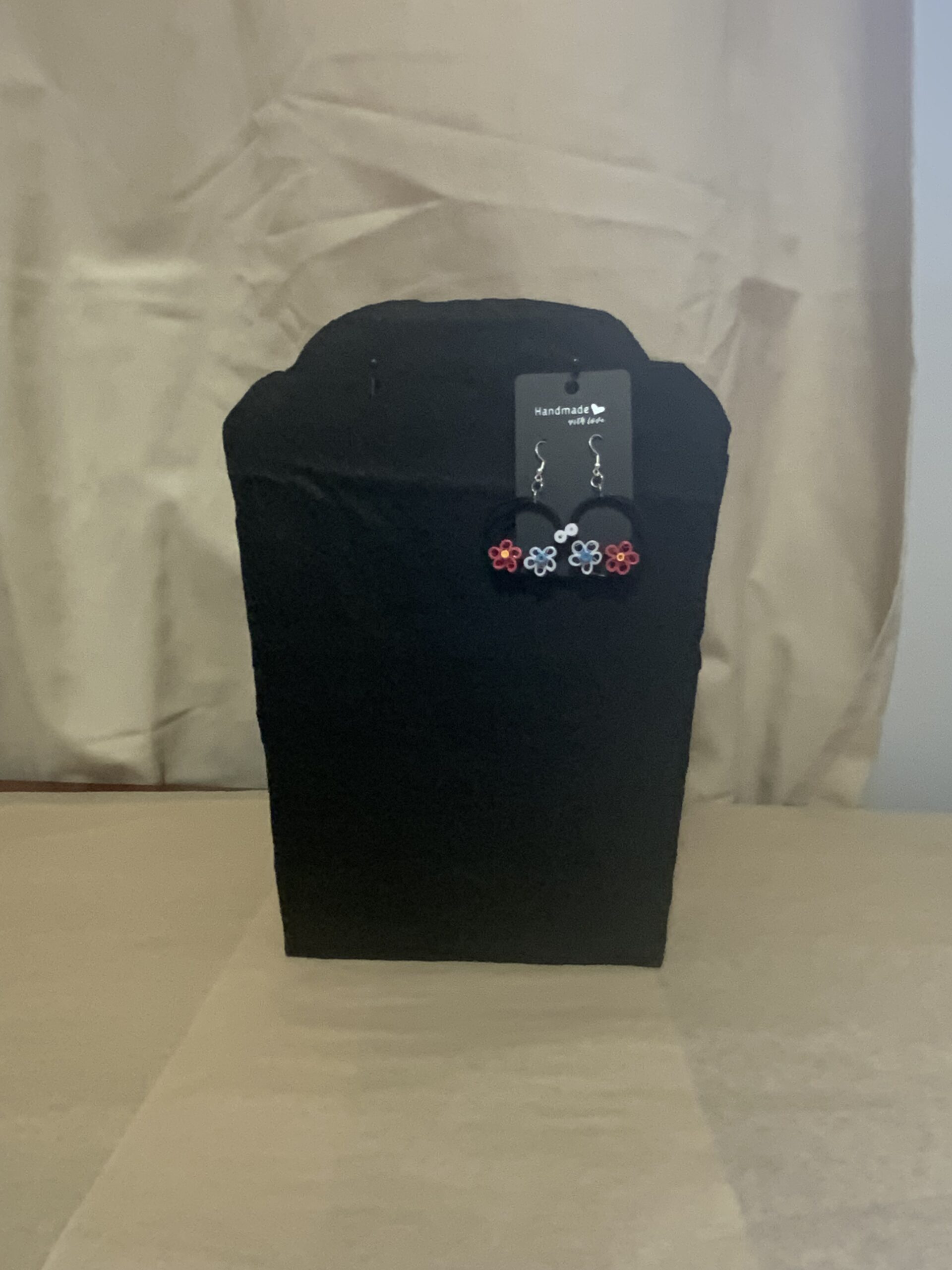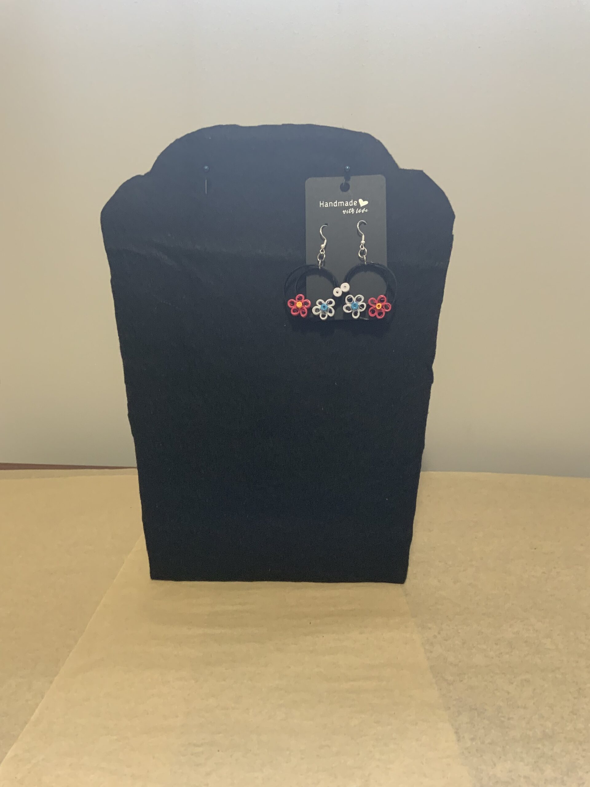 Add a touch of springtime charm to your outfit with these Quilled Circle Ring–Flowers Earrings, beautifully handcrafted from black paper rings adorned with delicate white and pink flowers. Made using the traditional paper quilling technique, these earrings are a perfect blend of art, fashion, and sustainability.